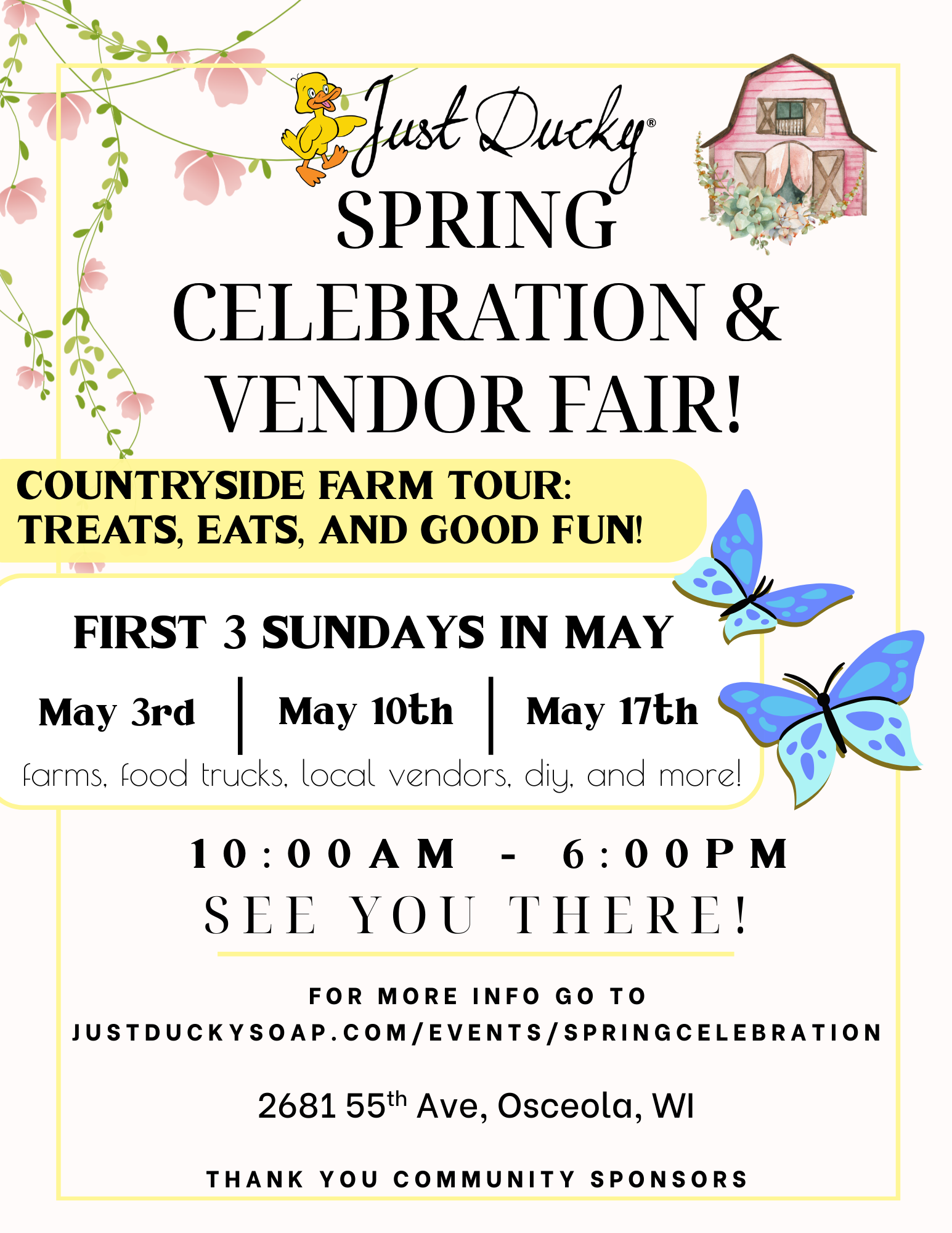 Farm Tours & Exhibition Booths, Local Community Services, Salon- Spa- & Wellness Care Providers, Food Trucks, & Open House at the Just Ducky® Store.